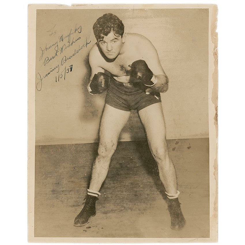 Vintage sepia glossy 8 x 10 photo, signed and inscribed in fountain pen, as champion, “To Johnny Murphy, Best wishes, Jimmy Braddock 1/5/37.” Dampstaining and paper loss to two sides, scattered creases and surface impressions to image, and a bit of light silvering, otherwise very good condition. Accompanied by a certificate of authenticity from PSA/DNA. RRAuction COA.