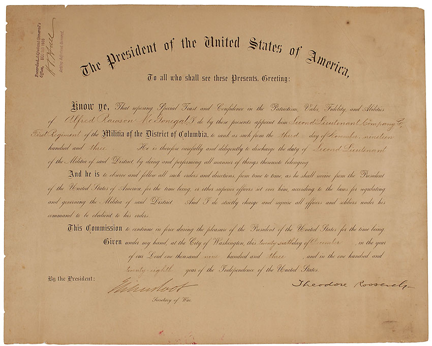 Partly-printed DS as president, one page, 17.5 x 14, December 26, 1903. President Roosevelt appoints Alfred Rawson McGonegal to a “Second Lieutenant Company C, First Regiment of the Militia of the District of Columbia.” Signed at the conclusion by Roosevelt and countersigned by Secretary of War Elihu Root. In very good condition, with uniform toning, scattered soiling, and curling to vertical edges from previous rolling. Pre-certified John Reznikoff/PSA/DNA and RR Auction COA.