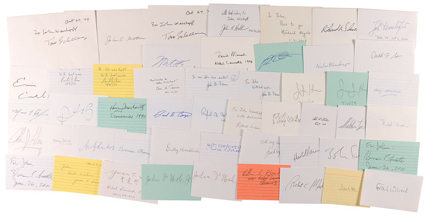 Ink and felt tip signatures of 46 Nobel Prize winners on individual various size cards, some lined, and a few inscribed. Signers are: Alexei Abrikosov, Sidney Altman, Philip Anderson, Kenneth Arrow (2), Baruj Benacerraf (2), Nicolaas Bloembergen (2), Paul Boyer, Mario Capecchi, Claude Cohen-Tannoudji (2), Leon Cooper, Eric Cornell, Johann Diesenhofer (2), Peter Doherty (2), John Fenn (2), Val Fitch, Alfred Gilman, Sheldon Glashow, John Hall, James Heckman (3), Alan Heeger, Dudley Herschbach, H. Robert Horvitz (2), William S. Knowles, Herbert Kroemer, Yuan Lee (2), Mairead Maguire (2), Harry Markowitz, John C. Mather (2), Robert C. Merton (2), Ferid Murad, John Nash (2), Marshall Nirenberg, Norman Ramsey, Andrew Schally (2), Thomas Schelling (2), Richard Schrock, Phillip Sharp (3), William Sharpe, Vernon Smith (2), Robert Solow, John Sulston, Charles Townes, Harold Varmus, James Watson, Frank Wilczek (2), and Rolf Zinkernagel (2). In fine condition. RRAuction COA.