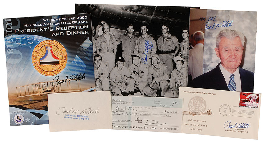Five items: glossy 10 x 8 Enola Gay crew photo, signed vertically in blue felt tip; satin-finish 5 x 8 photo taken at the Aviation Hall of Fame, signed and inscribed in blue felt tip; an FDC signed in blue felt tip; 2003 Aviation Hall of Fame reception and dinner program, signed on the front cover in black felt tip; and an ink signature, “Paul W. Tibbets,” on an off-white 5 x 3 card. Accompanied by a check endorsed on the reverse by General Charles Sweeney. In fine condition. RRAuction COA.
