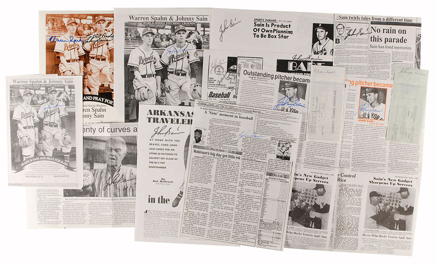 Thirteen items: cardstock 8 x 10 department store promotional photo, featuring an image of Spahn and Sain on the dugout steps, signed in blue felt tip by Spahn and signed and inscribed in black felt tip by Sain; a check endorsed by Sain; a check endorsed by Spahn; and ten photocopied articles from Sain’s personal archives, various sizes and lengths, each signed in felt tip by Sain. In very good condition. RRAuction COA.