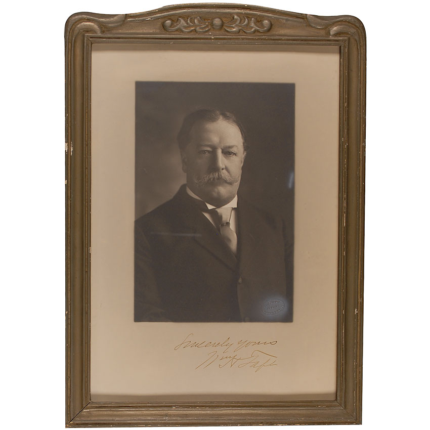 Striking matte-finish 9.5 x 13.5 1908 Harris & Ewing photo, signed in ink beneath the image, “Sincerely yours, Wm. H. Taft.” Presented in its original frame measuring 11.25 x 16 overall. Light silvering near photographer’s blindstamp at lower right, as well as some silvering to a crease along right edge of background, otherwise fine condition. Pre-certified John Reznikoff/PSA/DNA and RR Auction COA.