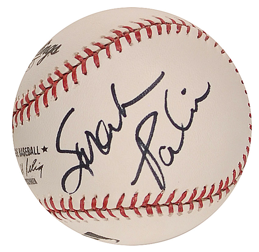 Official Rawlings Major League baseball signed in black felt tip on a side panel. In fine condition. RRAuction COA.