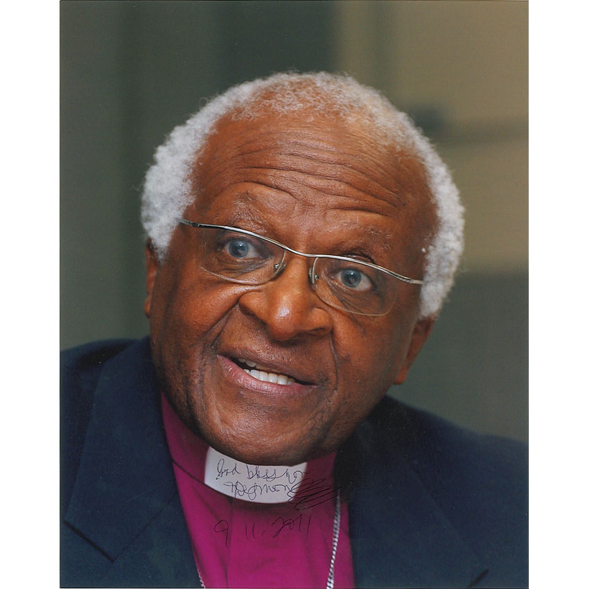 Two color stain-finish photos, one 8 x 10 and one 10 x 8, each signed in black ballpoint, “God bless you, Desmond Tutu 9/11/2011.” In fine condition, with a couple minor dings and some light contrast to one signature. RRAuction COA.