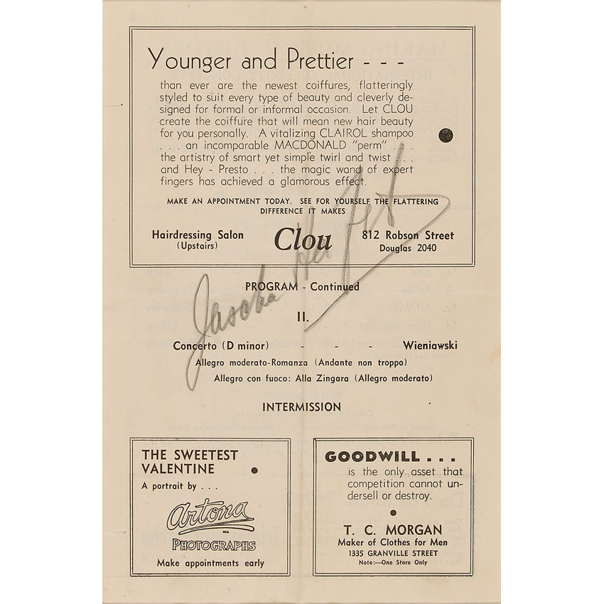 Vintage program page, 5.75 x 8.75, boldly signed in pencil by Heifetz. Matted with a color portrait to an overall size of 11 x 23. Central horizontal and vertical fold, with vertical fold passing though a single letter of signature, and some scattered light toning, otherwise fine condition. RRAuction COA.