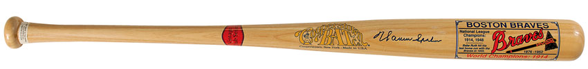 Official Cooperstown Bat Co. baseball bat commemorating the Boston Braves, signed in blue felt tip on the barrel. In fine condition. Pre-certified Steve Grad/PSA/DNA and RR Auction COA.