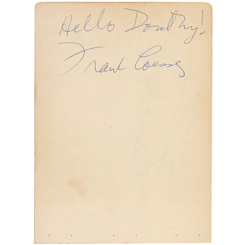 Academy and Tony Award-winning composer (1910-1969). Vintage ballpoint signature and inscription, “Hello Dorothy! Frank Loesser,” on an off-white 4.5 x 6 album page. In fine condition, with some light toning and creasing and mild show-through from a Roland Winters signature on reverse. RRAuction COA.