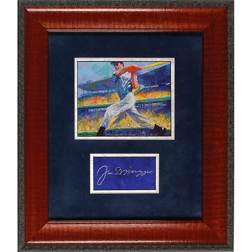 Silver ink signature, “Joe DiMaggio,” on a blue piece of canvas. Double suede matted and framed with a Nieman print of DiMaggio to an overall size of 14 x 16.25. In fine condition. Accompanied by a letter of authenticity from James Spence. Pre-certified Steve Grad/PSA/DNA and RR Auction COA.