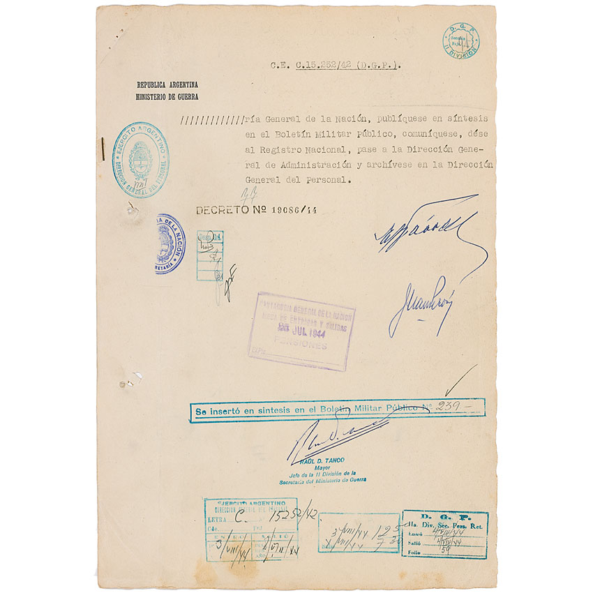DS, in Spanish, two pages, 8.75 x 13, July 20, 1944. Untranslated two-page official document, signed on the second page in blue ballpoint. In very good condition, with rusty staples and holes to left edge, several punch holes, uniform toning, and some scattered light creases. RRAuction COA.