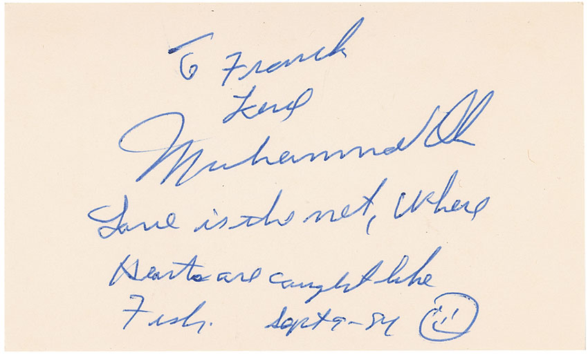 AQS on an off-white 5 x 3 card. Ali writes, “To Frank, Love, Muhammad Ali. Love is the net, where hearts are caught like fish. Sept. 9-84.” In fine condition. Pre-certified Steve Grad/PSA/DNA and RR Auction COA.