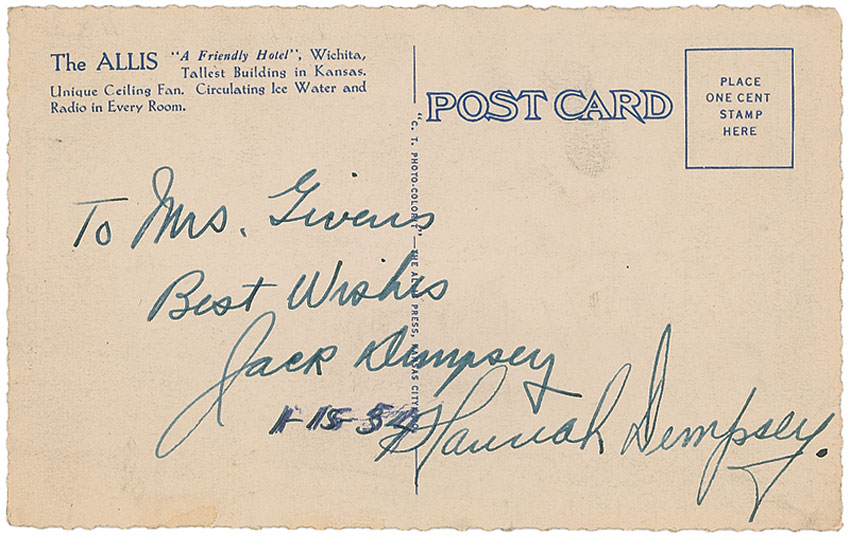Two vintage 5.25 x 3.25 postcards: one bearing a color photo of James Montgomery Flag’s portrait of the Dempsey–Willard fight, signed on the reverse in black ballpoint, “Thank you & good luck, Jack Dempsey”; and a deckle-edge postcard of the Allis Hotel, signed and inscribed on the reverse in fountain pen, “To Mrs. Givens, Best wishes, Jack Dempsey,” and also signed by Hannah Dempsey. In very good overall condition. RRAuction COA.