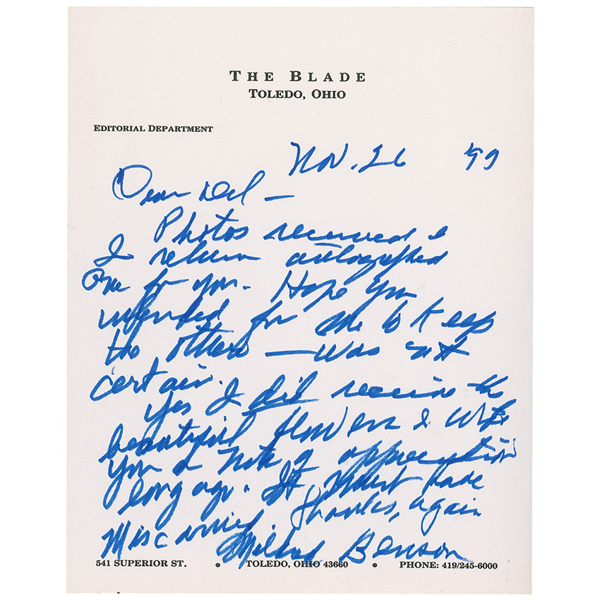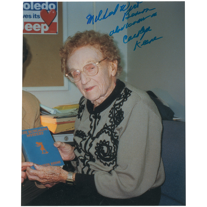 Author of the popular Nancy Drew mysteries (1905–2002), under the pseudonym Carolyn Keene. Though several ghostwriters would later use the moniker, Benson is historic as the first ever to write as ‘Carolyn Keene.’ Two items: color satin-finish 6.25 x 8 photo, signed in blue felt tip, “Mildred Wirt Benson also known as Carolyn Keene”; and a one-page ALS, signed Mildred Benson, on her Toledo Blade stationery, dated November 26, 1999. In fine condition, with trimmed edges to photo, with top trimmed edge slightly affecting beginning of signature. RRAuction COA.
