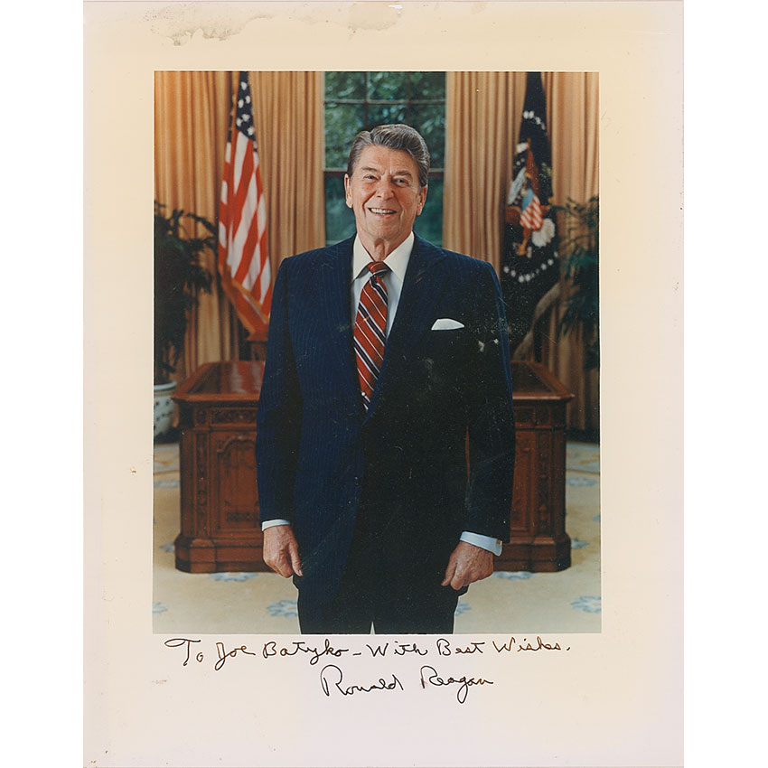 Color satin-finish 8 x 10 photo of Reagan standing in the Oval Office, signed and inscribed in the lower border in black felt tip “To Joe Batyko—With best wishes, Ronald Reagan.” In very good condition, with a few light bends and surface marks to image, light toning to borders from previous display, and some staining along top edge. RRAuction COA.