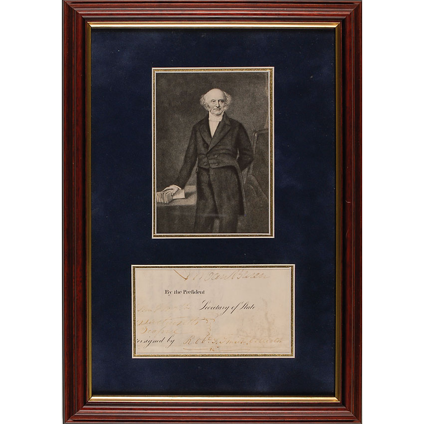 Ink signature, as president, “M. Van Buren,” on an off-white slip clipped from a larger document, also signed by Secretary of State John Forsyth. Double suede matted and framed with a portrait of Van Buren to an overall size of 10.75 x 15.25. In very good condition, with signature a couple shades light, but still legible, a central vertical fold passing through single letter of signature, show-through from writing on reverse, and some light staining. Pre-certified John Reznikoff/PSA/DNA and RR Auction COA.
