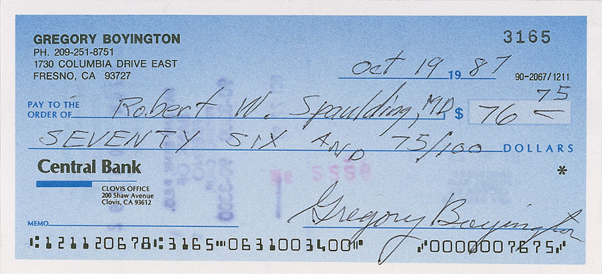 Personal check, 6 x 2.75, filled out and signed by Boyington, “Gregory Boyington,” payable to Robert W. Spalding, M.D. for $76.75, October 19, 1987. In fine condition, with light show-through from stamps on reverse. RRAuction COA.