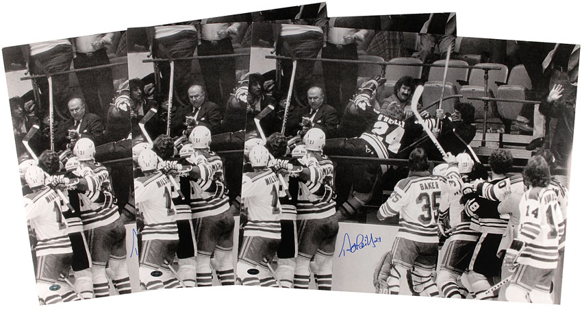 Three identical glossy 20 x 16 photos of O’Reilly storming into the stands after Rangers fans in Madison Square Garden after a Bruins–Rangers game in 1979, each signed in blue felt tip. In fine condition. RRAuction COA.
