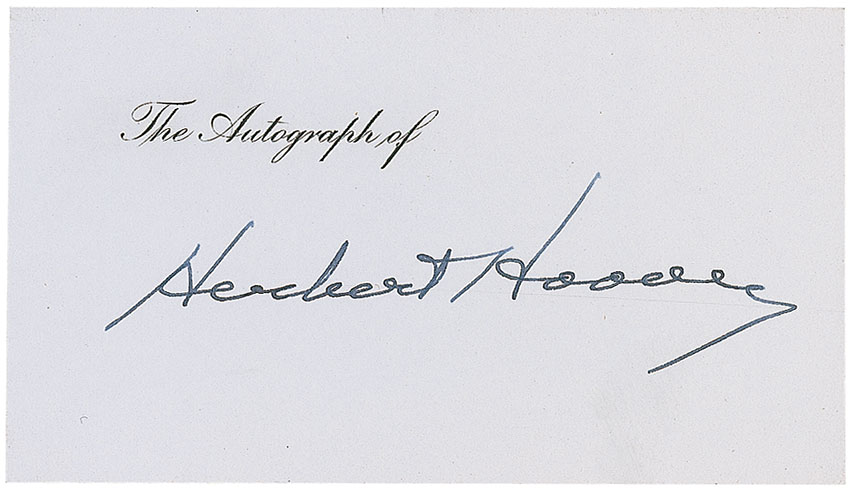 Ink signature, “Herbert Hoover,” on a 3.5 x 2 card printed with “The Autograph of,” along the top; and a White House card, signed in black ink, “Lou Henry Hoover.” In fine condition, with a uniform shade of mild toning to White House card as well as a touch of trivial soiling. Pre-certified John Reznikoff/PSA/DNA and RR Auction COA.