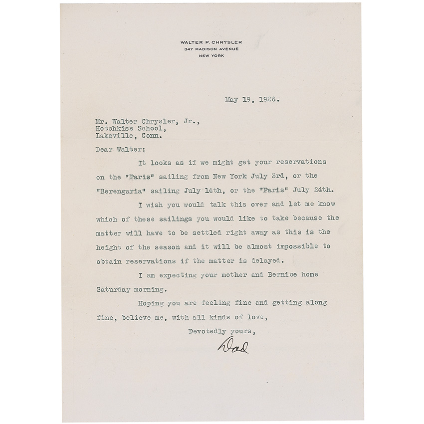 Automotive mogul (1875–1940) who founded the Chrysler Corporation. TLS signed “Dad,” one page, 7.25 x 10, personal letterhead, May 19, 1926. Letter to his son at The Hotchkiss School. In part: “It looks as if we might get your reservations on the ‘Paris’ sailing from New York…or the ‘Berengaria’…I wish you would talk this over and let me know which of these sailings you would like to take because the matter will have to be settled right away.” In fine condition, with some light creases. Accompanied by a personal check filled out and signed by Walter P. Chrysler, Jr. Pre-certified PSA/DNA and RR Auction COA.