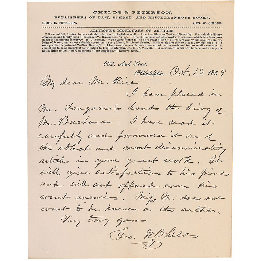 Publisher (1829–1894) who co-owned the Philadelphia Public Ledger newspaper with financier Anthony Joseph Drexel. ALS signed “Geo. W. Childs,” one page, 6.25 x 8, Child & Peterson letterhead, October 13, 1859. Letter to Mr. Rice. In part: “I have placed in Mr. Longacre’s hands the biog of Mr. Buchanan. I have read it carefully and pronounce it one of the ablest and most disseminating in your great work.” Intersecting folds, one through a single letter of signature, and a uniform shade of mild toning, otherwise fine condition. RRAuction COA.