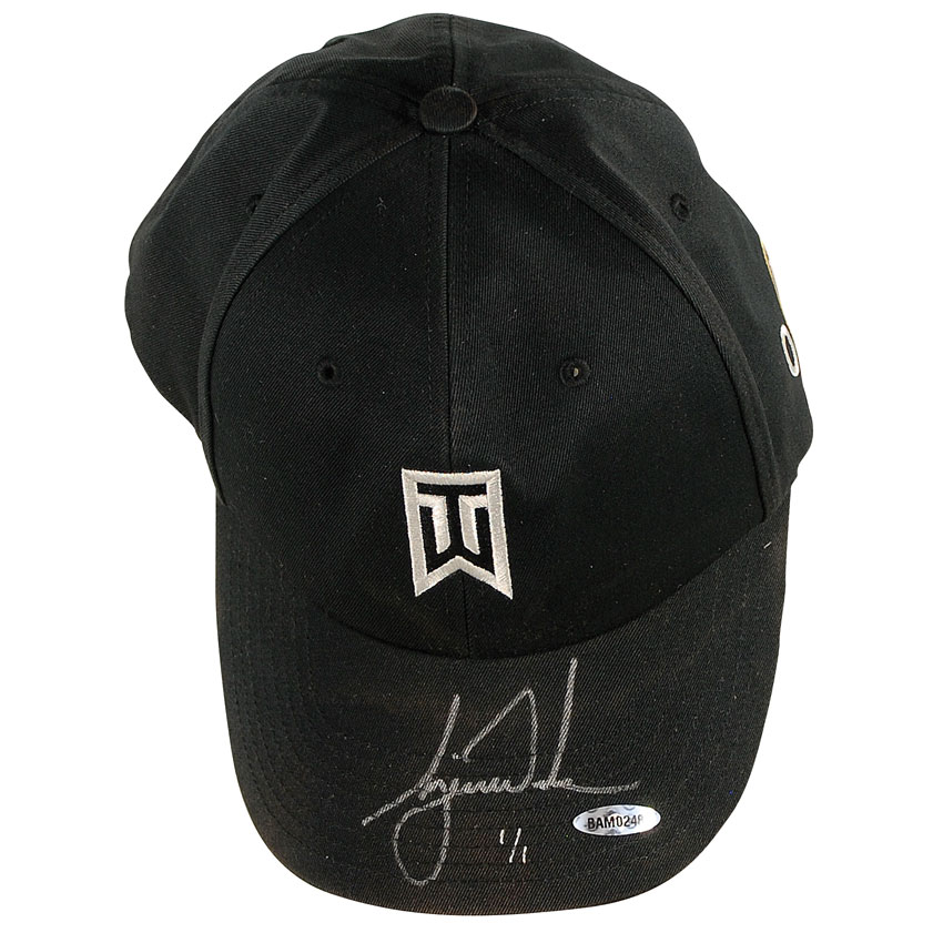 Incredibly rare limited edition Tiger Woods TW tournament-worn golf hat, #1/1 signed in silver ink on the brim. In fine condition, with expected wear and light discoloration from perspiration. Accompanied by a certificate of authenticity from Upper Deck, as well as its original cloth bag and Upper Deck box. One of the most difficult to acquire of all Woods’ Upper Deck authenticated items. Pre-certified Steve Grad/PSA/DNA and RR Auction COA.