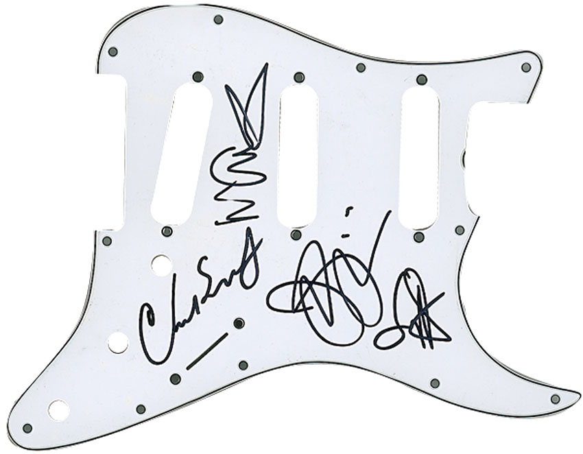 White pickguard for a standard-size Strat, signed in black felt tip by Sammy Hagar, Joe Satriani, Michael Anthony, and Chad Smith. In fine condition, with some scattered light surface marks. RRAuction COA.