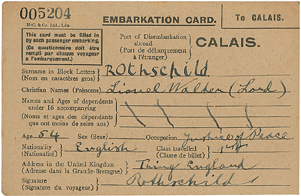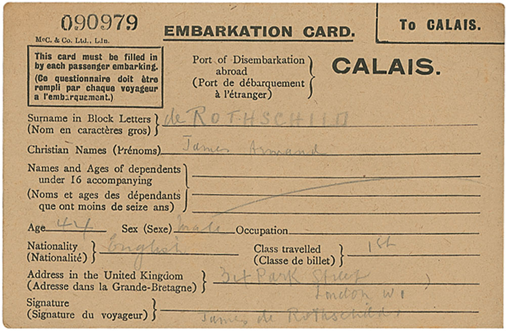 Two embarkation cards, each 6 x 4, filled out and signed by James and Lionel de Rothschild respectively. Lionel’s is filled out in fountain pen, giving his Christian name, age, and occupation, signed at the conclusion, “Rothschild”; and James’s is filled out in pencil, giving his Christian name and signing at the bottom, “James de Rothschild.” In fine condition, with a central vertical crease to James’s card, and his writing a couple of shades light, but still legible. RRAuction COA.