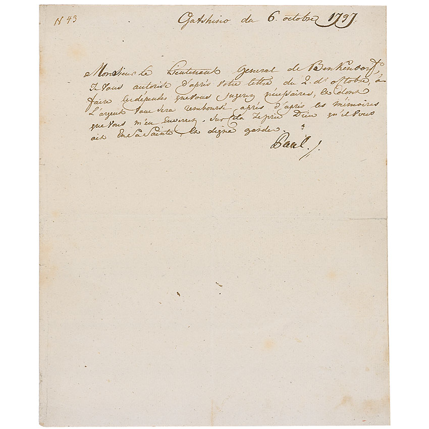 Emperor of Russia (born 1754) from 1796 until his assassination in 1801, the son of Catherine the Great, and a champion of the poorer classes, his sweeping reforms alienated the Russian nobility and were thought to have provided a prime motivation for the conspiracy that led to his brutal death. LS in French, one page, 7.5 x 9, Gatshino, October 6, 1797. To Lieutenant General de Benkendorf authorizing him to effect the necessary expenses that will later be reimbursed. Central horizontal and vertical fold, some scattered light creases and spots of toning, and some paper loss to blank second integral page, otherwise fine condition. RRAuction COA.
