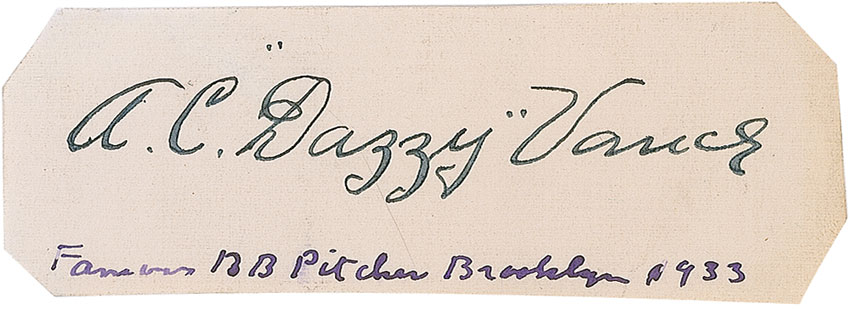 Baseball Hall of Famer (1891–1961) who was the dominant National League pitcher of the 1920s. Vintage fountain pen signature, “A. C. 'Dazzy’ Vance,” on an off-white 3.5 x 1.25 clipped slip with a collector’s notation along bottom. In fine condition, with a couple thin areas of paper and clipped edges and corners. Pre-certified Steve Grad/PSA/DNA and RR Auction COA.