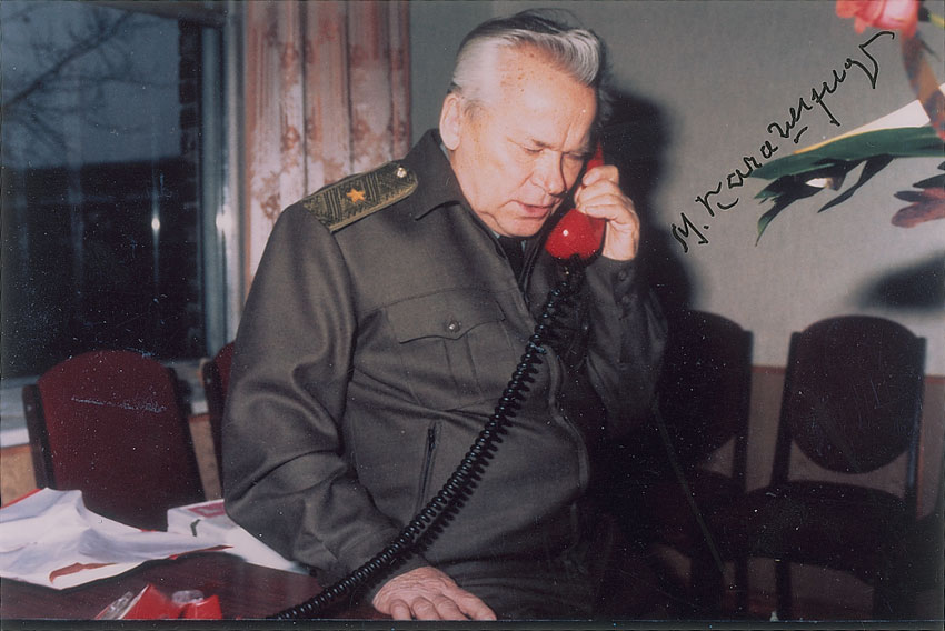 Russian lieutenant general and arms designer most famous for designing the AK-47 assault rifle. Color glossy 6 x 4 photo of Kalashnikov on the phone, signed in black felt tip. In fine condition. RRAuction COA.