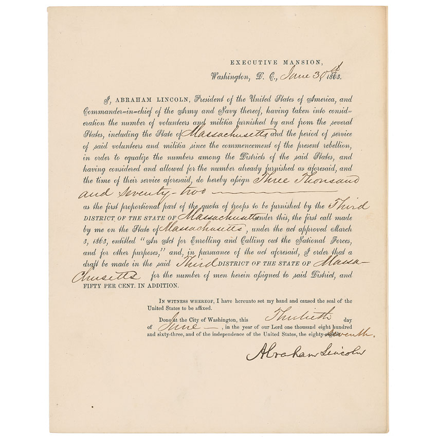 Partly-printed war-dated DS as president, one page (with attached integral blank leaf), 7.75 x 9.75, June 30, 1863. Lincoln calls out Massachusetts men for military service. In full, “I, Abraham Lincoln, President of the United States of America, and Commander-in-chief of the Army and Navy thereof, having taken into consideration the number of volunteers and militia furnished by and from the several States, including the State of Massachusetts, and the period of service of said volunteers and militia since the commencement of the present rebellion, in order to equalize the numbers among the Districts of said States, and having considered and allowed for the number already furnished as aforesaid, and the time of their service aforesaid, do hereby assign Three thousand and seventy-two as the first proportional part of the quota of troops to be furnished by the Third District of the State of Massachusetts under this, the first call made by me on the State of Massachusetts, under the act approved March 3, 1863, entitled ‘An Act for Enrolling and calling out the National Forces, and for other purposes,’ and in pursuance of the act aforesaid, I order that a draft be made in the said Third District of the State of Massachusetts, for the number of men herein assigned to said District, and fifty percent in addition.” In fine condition, with a uniform shade of light toning and a few trivial wrinkles.