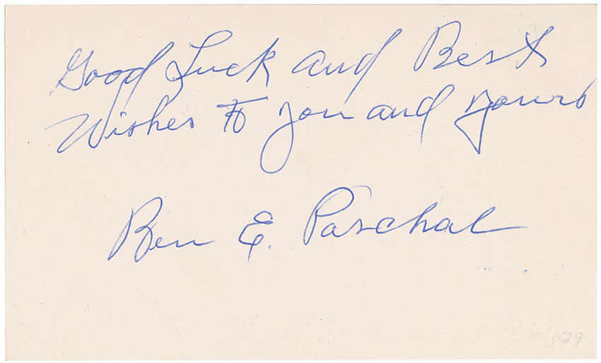 Outfielder (1895–1974) who played for the Cleveland Indians, Boston Red Sox, and New York Yankees, whom he helped to World Series victories in 1927 and 1928. On April 12, 1927, in the first game of the season, Paschal was the last player ever to pinch hit for Babe Ruth. Ballpoint signature and inscription, “Good luck and best wishes to you and yours, Ben E. Paschal,” on an off-white 5 x 3 card. In fine condition. Pre-certified Steve Grad/PSA/DNA and RR Auction COA.