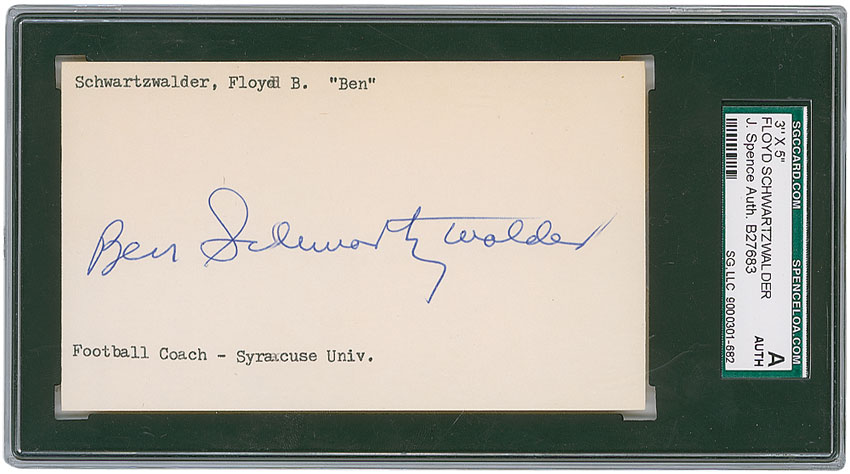 Famed College Football Hall of Fame coach of Syracuse, who coached Heisman Trophy Winner Ernie Davis (1909–1993). Ballpoint signature, “Ben Schwartzwalder,” on an off-white 5 x 3 card, with typed collector’s notations to top and bottom edge. Card is encapsulated in a plastic James Spence authentication holder. In fine condition. Pre-certified Steve Grad/PSA/DNA and RR Auction COA.