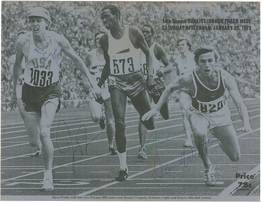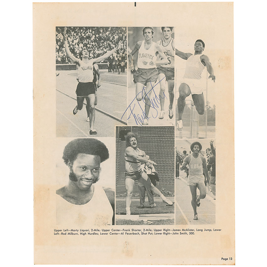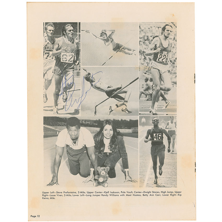 Promising American long-distance runner (1951–1975) who was killed in an auto accident at the age of 24. Program from the 14th Annual Sunkist Indoor Track Meet, held on January 20, 1973, 8.5 x 11, 22 pages. Signed inside in blue ballpoint next to his image by Steve Prefontaine and signed on the opposite page by Frank Shorter. Program is also signed on the front and back covers by six others. In very good to fine condition, with ballpoint notations to event pages indicating winners and times, toning to inside pages from scattered news clippings, light soiling, contrast to signatures on the front cover, and expected light handling wear. Pre-certified Steve Grad/PSA/DNA and RR Auction COA.