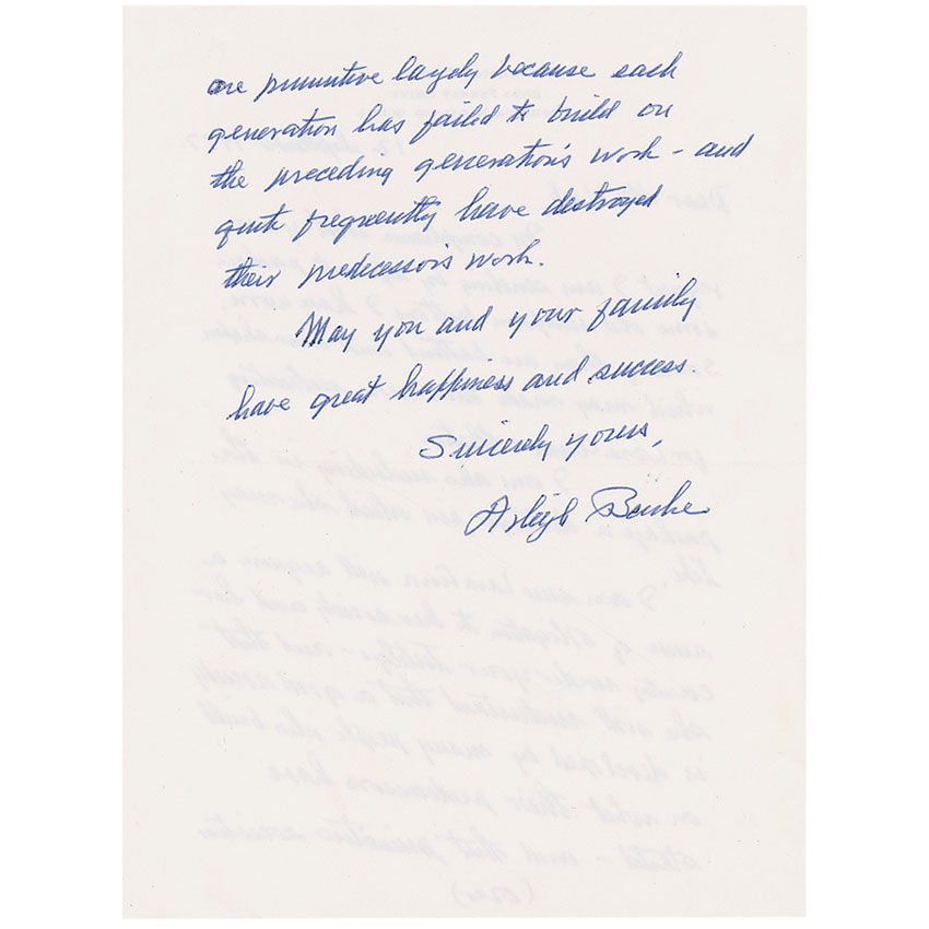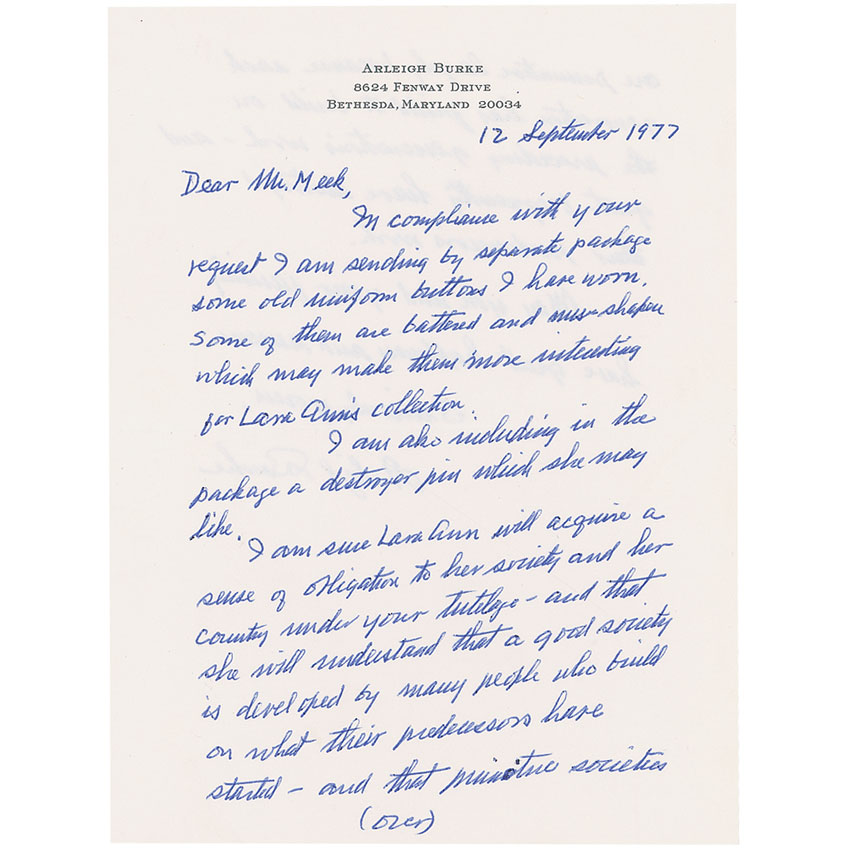 Admiral of the United States Navy (1901–1996) who distinguished himself during World War II and the Korean War, and who served as chief of naval operations during the Eisenhower and Kennedy administrations. ALS, one page both sides, 5.75 x 7.75, personal letterhead, September 12, 1977. Letter to Mr. Meek. In part: “In compliance with your request I am sending by separate package some old uniform buttons I have worn…I am sure Lara Ann will acquire a sense of obligation to her society and her country under your tutelage—and that she will understand that a good society is developed by many people who build on what their predecessors have started—and that pessimistic societies are pessimistic largely because each generation has failed to build on the preceding generations work.” In fine condition. RRAuction COA.