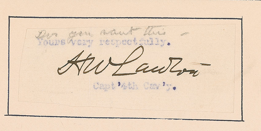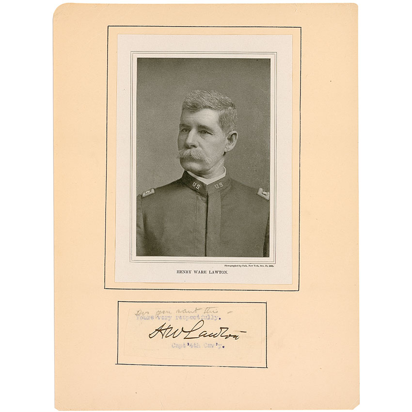 US Army officer (1843–1899) who served with distinction in the Civil War for which he received the Congressional Medal of Honor, the Apache Wars, the Spanish-American War and was the only US general officer to be killed during the Philippine-American War. Ink signature, “H. W. Lawton,” on an off-white 4 x 1.5 slip clipped from the closing of a letter. Slip is affixed to an 8.5 x 11 scrapbook page along with a photo. In fine condition, with a vertical fold through one initial, a couple wrinkles, and pencil notation along top edge. RRAuction COA.