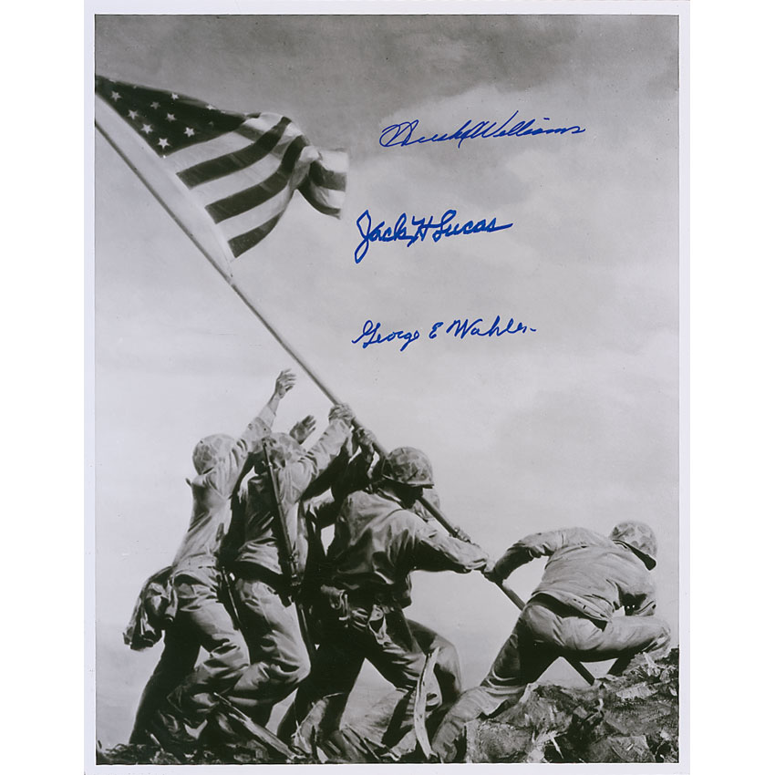 Glossy 14 x 11 photo of the Iwo Jima flag raising, signed in blue felt tip by three Medal of Honor recipients from that battle: Jack Lucas, Hershel Williams, and George Wahlen. In fine condition. RRAuction COA.