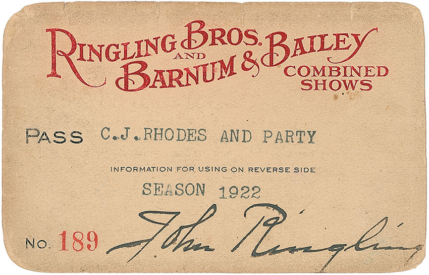 John (1866–1936), youngest of the famed Ringling brothers, was involved in a number of successful business enterprises. In 1929 he purchased the Circus Corporation of America, which gave him control of 11 circuses. Ringling Bros.and Barnum & Bailey Combined Shows 1922 circus pass, 4 X 2.5, issued to “C. J. Rhodes and Party,” signed at the bottom in black ink by John Ringling. In very good condition, with scattered light toning and soiling, some light feathering to signature, and a few small vertical tears to top edge. Accompanied by a 1922 letter of transmittal from Richard Fuchs forwarding the pass to Rhodes on behalf of Ringling and the original mailing envelope. Pre-certified PSA/DNA and RR Auction COA.