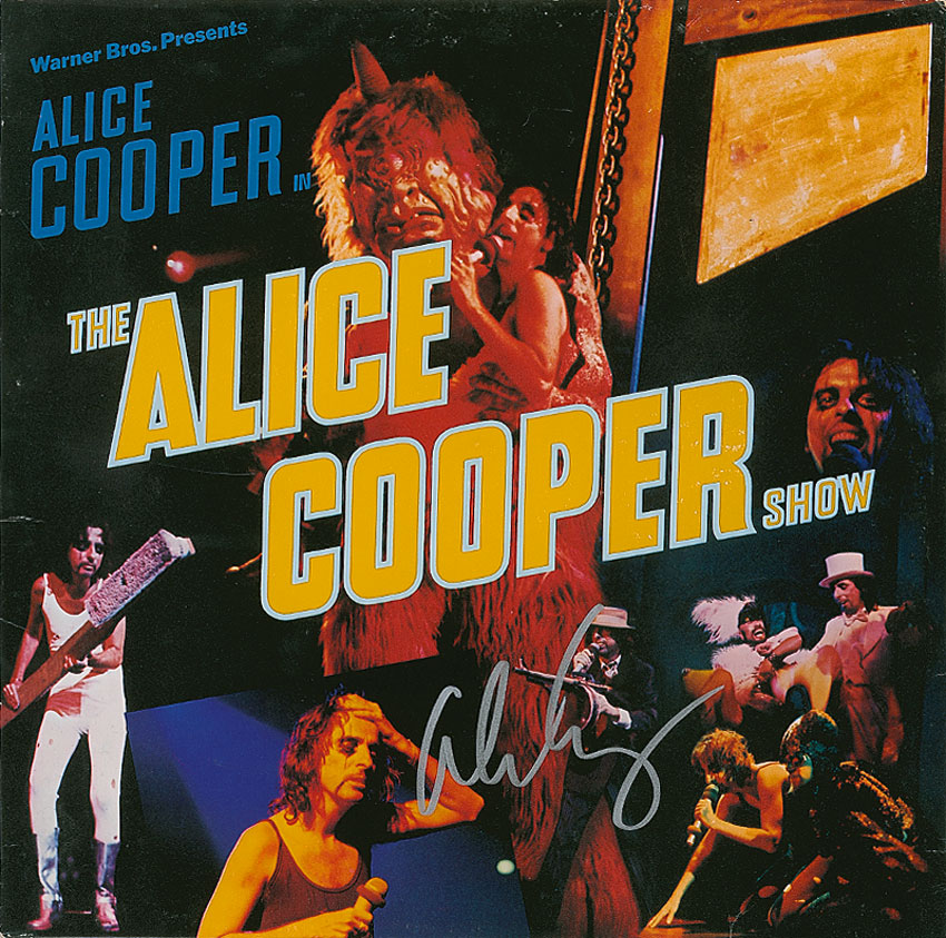 Two items: Alice Cooper Show album, signed on the front cover in silver ink. The record is included; and a satin-finish 8 x 10 photo of Cooper with a daisy in his hair, signed in blue felt tip. In fine condition. RRAuction COA.