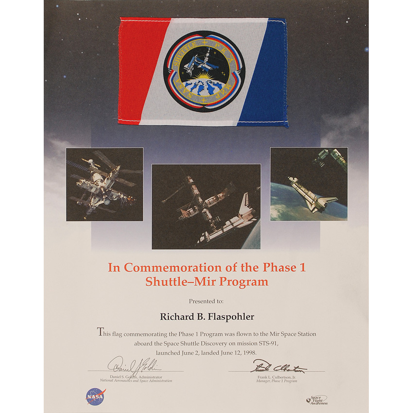 Flown printed fabric Shuttle-Mir Program flag, 5.5 x 3.5, flown aboard Discovery on mission STS-91 in June of 1998. Flag is affixed to a color 10.75 x 14 certificate presenting the flag to Richard B. Flaspohler, and states “This flag commemorating the Phase I program was flown to Mir Space Station aboard the Space Shuttle Discovery on mission STS-91, launched June 2, landed June 12, 1998.” Bottom of certificate bears printed signatures of Daniel Goldin and Frank Culbertson. In fine condition, with a few light creases to certificate. Certificate is housed in its original folder. RRAuction COA.