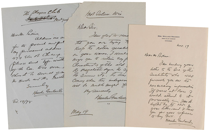American writer (1860–1940) who won the Pulitzer Prize in 1922 for his autobiographical volume, A Daughter of the Middle Border. Three ALSs, one dated 1898 and two undated, with the 1898 letter providing his permanent address in Chicago and asking the recipient to “please send type-written proof.” In overall fine condition, with handling wear and a torn upper left corner of one letter. RRAuction COA.