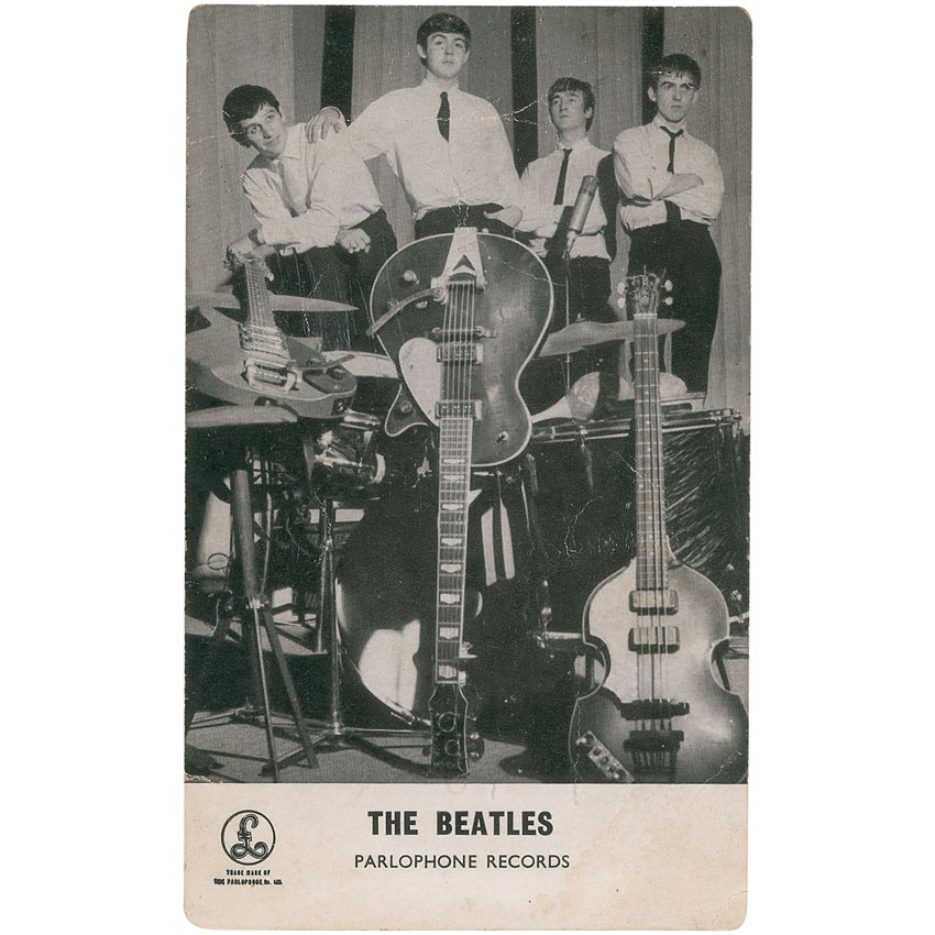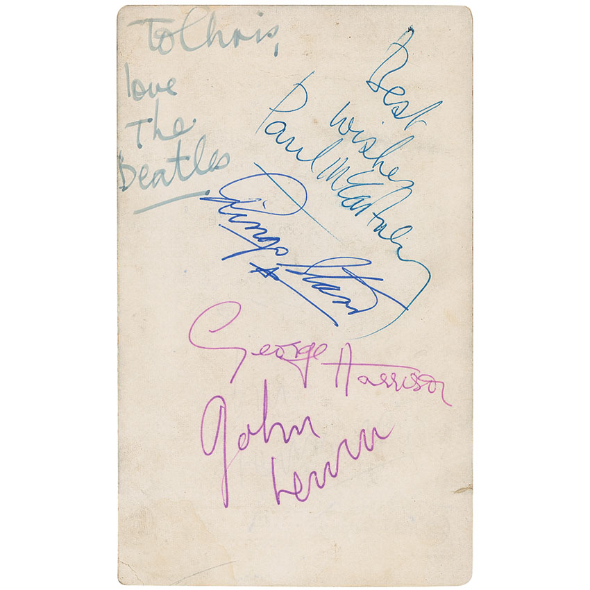 Vintage 3.5 x 5.75 Parlophone postcard photo, signed on the reverse in blue ballpoint, “Best wishes, Paul McCartney,” and “Ringo Starr,” and in purple ballpoint, “George Harrison,” and “John Lennon.” McCartney has also added an inscription in fountain pen, “To Chris, love the Beatles.” Scattered creases and soiling, more prevalent on reverse, and a trivial tear to one edge, otherwise fine condition. Photo on the front was originally taken by Dezo Hoffman while the Beatles were recording ‘Love Me Do’ at EMI Studios in London on September 4, 1962. A truly outstanding set of signatures acquired prior to the explosion of Beatlemania. Pre-certified Roger Epperson/REAL and RR Auction COA.