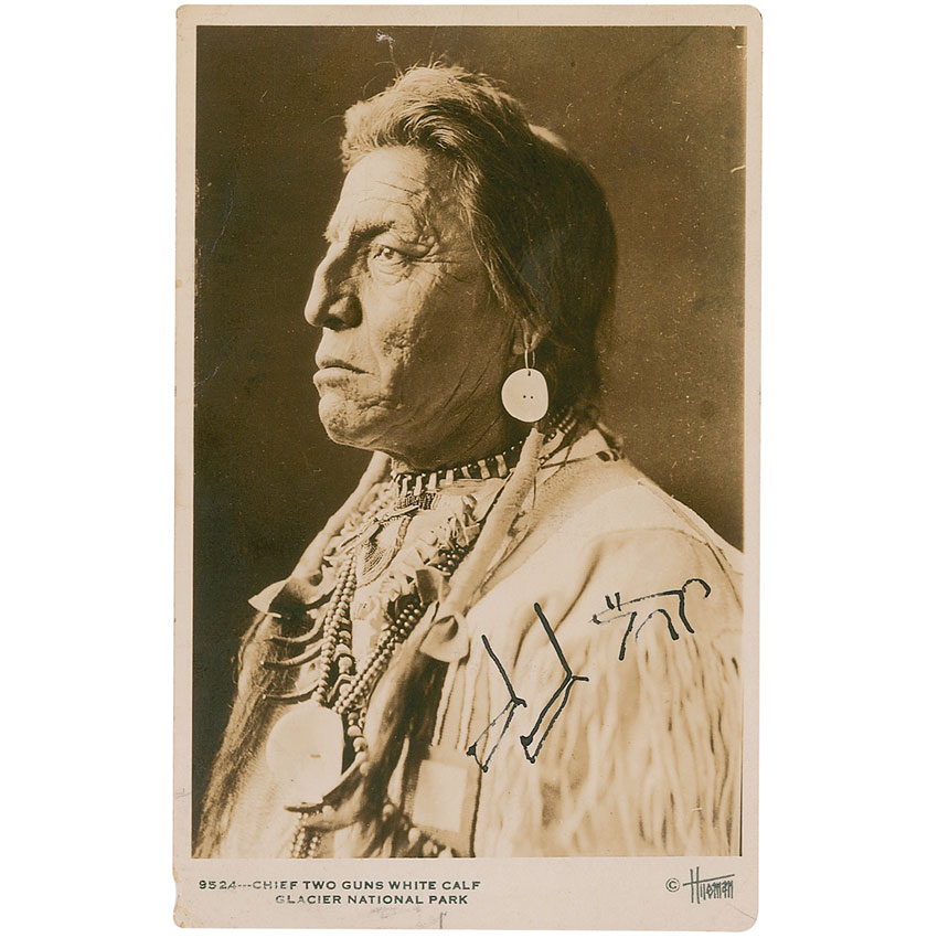Blackfoot chief (1872–1934) best known for the durable though still-controversial claim that he served as one of models for sculptor James Earle Fraser in creating the composite Native American portrait on the ‘Buffalo’ nickel. Scarce and distinguished vintage 3.25 x 5.25 postcard photo, signed in black ink with his three-character pictogram of two rifles and a horned calf. In very good condition, with scattered creases, missing lower left corner tip, and some scattered silvering. Pre-certified John Reznikoff/PSA/DNA and RR Auction COA.