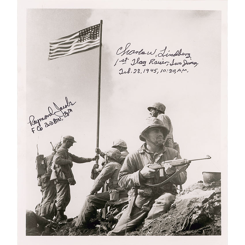 Satin-finish 8 x 10 photo of the first flag raising on Mount Suribachi, signed in black felt tip, “Charles W. Lindberg, 1st Flag Raiser, Iwo Jima, Feb. 23, 1945, 10:30, A. M.” and “Raymond Jacobs, F. Co. 2nd Btn, 28th.” In very fine condition. RRAuction COA.