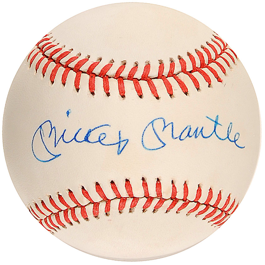 Official Rawlings American League baseball signed in blue ballpoint on the sweet spot. In fine condition, with some scattered light toning, none affecting the signature. Accompanied by two unsigned Mickey Mantle commemorative baseball cards. Pre-certified Steve Grad/PSA/DNA and RR Auction COA.