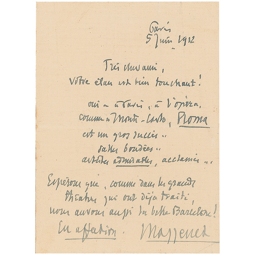 French composer (1842–1912) best known for such operas as ‘Manon,’ ‘Werther,’ and ‘Thais.’ ALS in French, signed “Massenet,” one page, 4.75 x 6, June 5, 1912. Untranslated letter written from Paris to a friend. In fine condition, with a central horizontal fold and a bit of scattered light toning and soiling. RRAuction COA.
