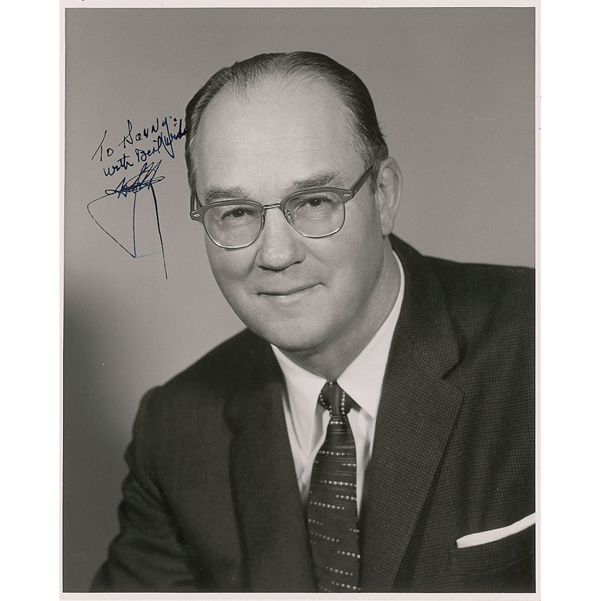 Owner of the New York Yankees from 1945-1964, Del Webb was also a renowned real estate developer (1899–1974) who founded the retirement community of Sun City, Arizona. He built the Flamingo Hotel in Vegas for Bugsy Siegal. Glossy 8 x 10 head-and-shoulders photo, signed and inscribed in black ink “To Danny, with best wishes, Del Webb.” Some scattered light creases and surface marks, otherwise fine condition. Accompanied by the original Del E. Webb Corporation mailing envelope. RRAuction COA.