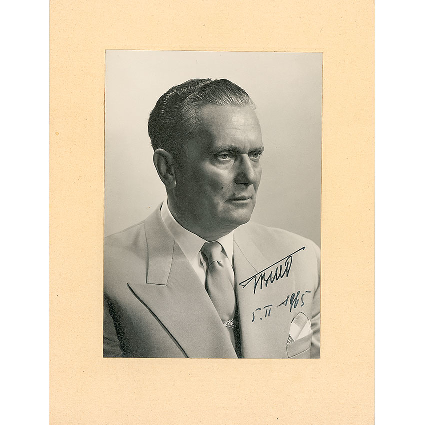 Longtime leader of Yugoslavia (born 1892) from 1945 until his death in 1980. Vintage matte-finish 5 x 7 head-and-shoulders photo, affixed to its original 7.25 x 9.5 mount, signed on the image in fountain pen and dated 1965. In fine condition. Accompanied by a pre-printed compliments slip from the president’s office. RRAuction COA.