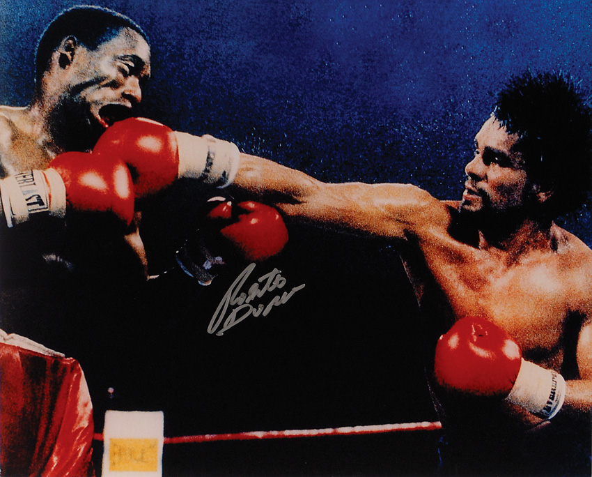 Color satin-finish 20 x 16 photo of Duran connecting with a punch to the chin of his opponent, signed in silver ink. In fine condition. Pre-certified Steve Grad/PSA/DNA and RR Auction COA.