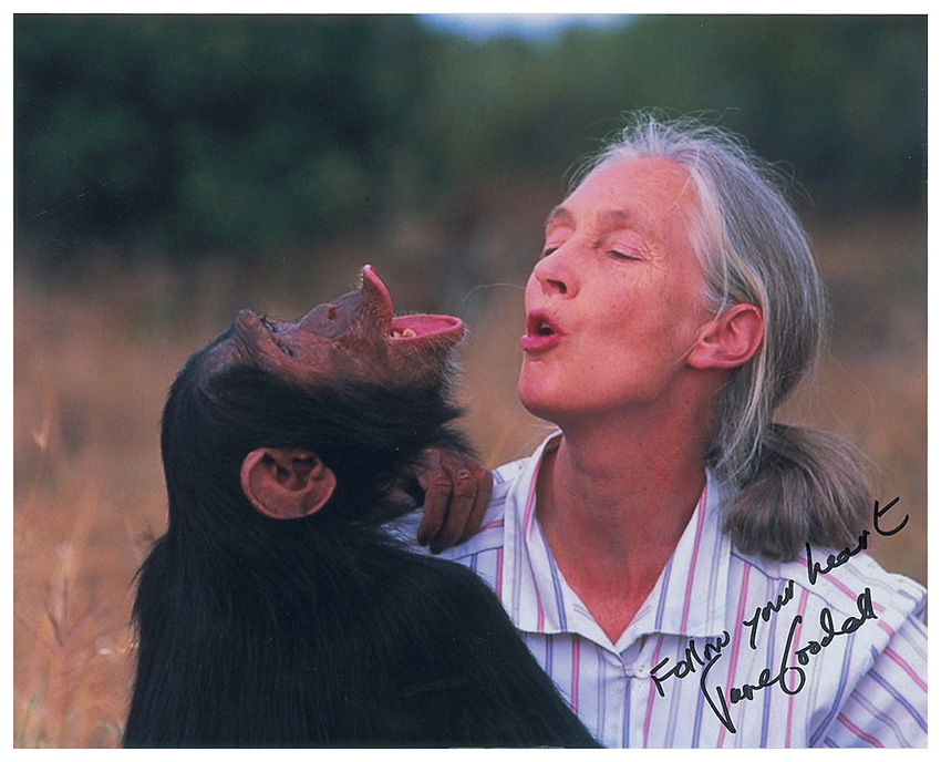Color satin-finish 10 x 8 photo of Goodall and a simian friend, signed in black felt tip “Follow your heart, Jane Goodall.” In fine condition. RRAuction COA.