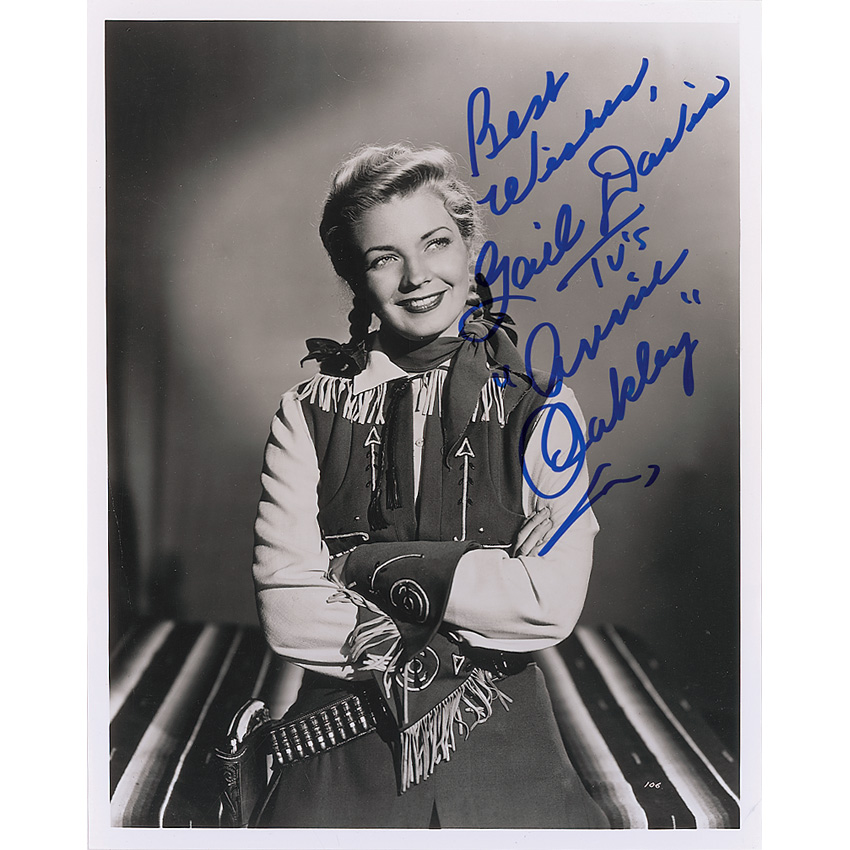 Glossy 8 x 10 photo of Davis as Annie Oakley, signed in blue felt tip, “Best wishes, Gail Davis, TV’s ‘Annie Oakley.’” In fine condition. Pre-certified PSA/DNA and RR Auction COA.